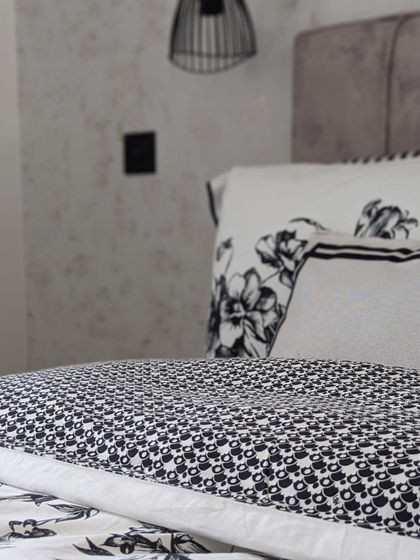 A stone-grey divan bed with a cushioned headboard and black lampshades brought timeless elegance, while large windows and gold-accented curtains in recycled velour fabric framed the large picture windows beautifully. Wood slat panels for behind the tv provided for a natural feature and ambience.